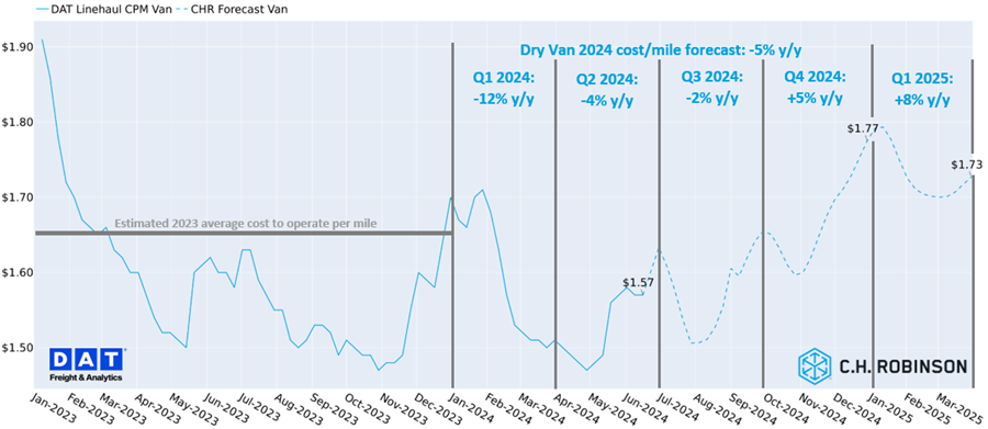Unsere Kostenprognose für den Fernverkehr mit trockenen Transportern für das Jahr 2024 wurde im Vergleich zum Vorjahr um -2 % auf -5 % gesenkt. Unsere Änderungen an der Prognose werden von mehreren Faktoren beeinflusst, die sowohl dem Angebot als auch der Nachfrage zugrunde liegen. Angebotsseitig befinden wir uns weiterhin in einer langwierigen Phase des Überangebots. In unserem Robinson-Bericht vom Oktober letzten Jahres diskutierten wir die beiden Hauptursachen dafür: