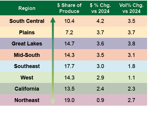 There has been balanced growth in dollar sales and pounds across all regions thru 20 weeks. The South Central, Plains, and Great Lakes continue to hold the top 3 spots for growth.