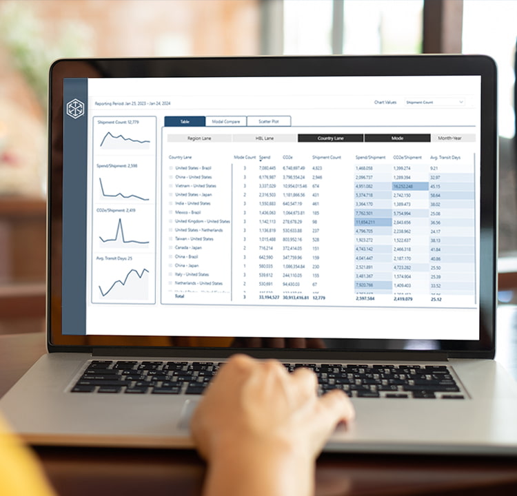 Vea y compare sus emisiones de carbono para todos los envíos aéreos, de carga de contenedor completo (full container load, FCL) y de carga parcial (less than a container load, LCL) a lo largo del tiempo. Use la información para mejorar los esfuerzos de sostenibilidad de su cadena de abastecimiento.