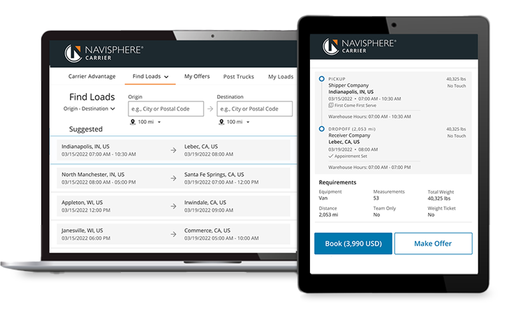 Créez un compte Navisphere® Carrier pour commencer à réserver des chargements. Conçu pour les transporteurs de toutes tailles, Navisphere Carrier facilite le transport des chargements que vous aimez—de la réservation instantanée aux chargements recommandés.