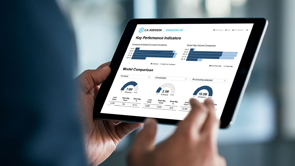 Dzięki rozwiązaniu Emissions IQ możemy pomóc Ci zmierzyć emisje z zakresu 3-ciego generowane przez transport naziemny zlecany firmie C.H. Robinson.